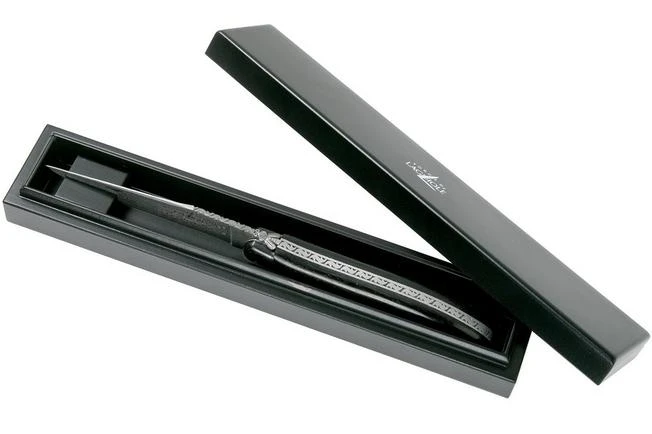This stunning Forge de Laguiole-Laguiole knife has a handle made from ebony wood. The blade is made from high-end Damasteel from Sweden. In this case in the Munin pattern. You open the knife with two hands and a slipjoint keeps the blade open.