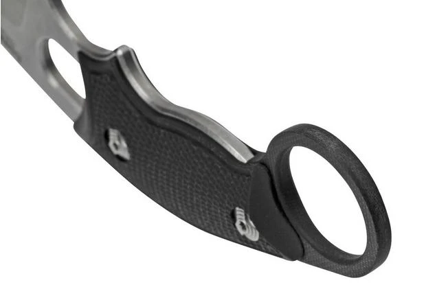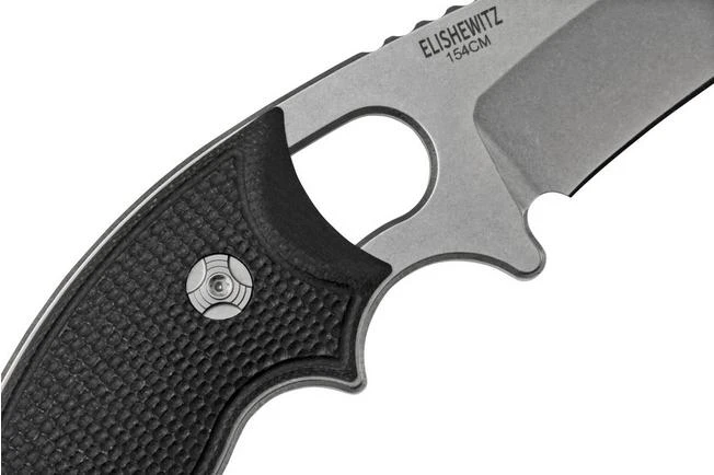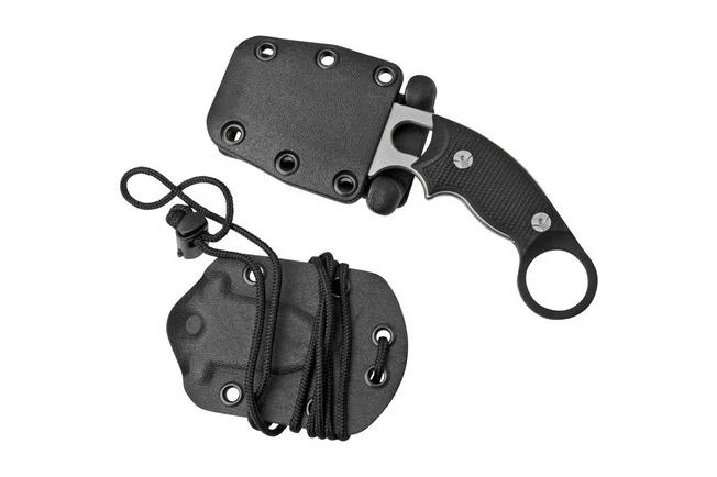 The Hogue EX-F03 is a lightweight neck knife, designed by knife maker Allen Elishewitz. The blade is made from 154CM steel and enhanced with a stonewashed finish. The end of the handle is enhanced with a lanyard eye with a piece of knotted rope. Because of the large cut-out in the handle the weight is low, great for a neck knife. It also enables you to wrap paracord around the handle. For a neck knife this knife is quite large. Where you sometimes see that the handle of a neck knife is difficult to handle with large hands, this handle offers enough grip. The blade, with its 5.5 cm cutting surface, is also comfortable to use.