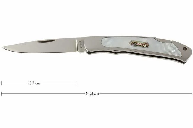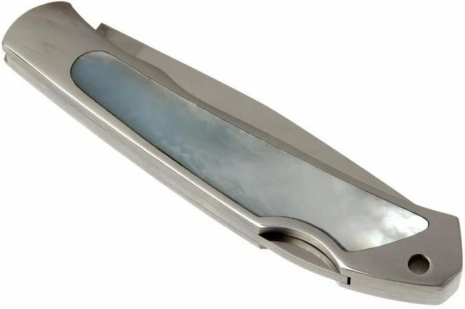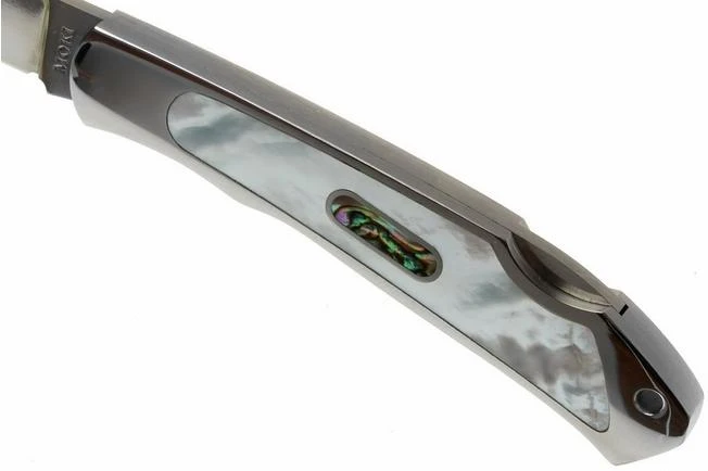 Nacre is a material that already comes with a natural luxurious look. The Moki MK610AB has an inlay with this natural material which is done in a beautiful way. On one side the nacre also has an inlay itself with the nacreous material of an abalone shell. This material is used more often in jewellery and it has magical properties according to some people. It is certain anyway that it looks special. The precision with which the nacre and the abalone shell are separated by means of a steel edge is typical for the quality of this knife. You do not feel the transitions between the different materials. The exclusive character of this knife does not mean you cannot use it. The fact that the blade is made of VG10-steel proves that. It is possible to attach a lanyard in order to make sure you will not lose this knife.