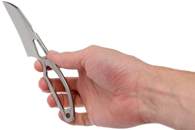 The Real Steel Alieneck Utility is a cool neck knife, designed by Ostap Hel. As you might expect from a neck knife you can carry this knife discretely. Because of the slight curve in the blade it is amazing to work with. After all, the material that is being cut is slightly pulled towards the edge.