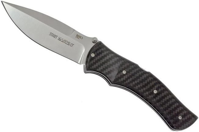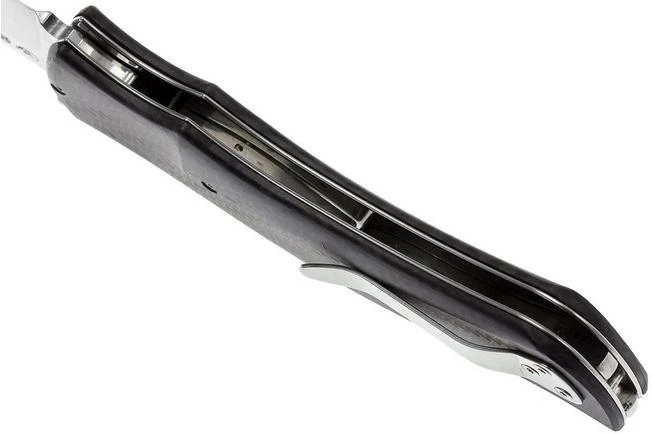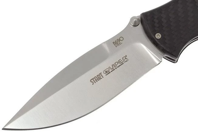 The Viper Start is a big knife with ergonomically sound shapes. The blade of steel N690-steel is thinned-out towards the back to save weight. All edges are nicely rounded, which you can also see on the spring and liners. Combined with the ergonomically designed handles this knife lies very comfortable in the hand. The blade is locked in the open position by a sturdy back-lock. In the beginning it may not run as smoothly, but that will go better over time. The end of the grip has a hidden spacer and lanyard hole. A beautifully subtle detail on a gorgeous knife.