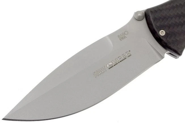 The Viper Start is a big knife with ergonomically sound shapes. The blade of steel N690-steel is thinned-out towards the back to save weight. All edges are nicely rounded, which you can also see on the spring and liners. Combined with the ergonomically designed handles this knife lies very comfortable in the hand. The blade is locked in the open position by a sturdy back-lock. In the beginning it may not run as smoothly, but that will go better over time. The end of the grip has a hidden spacer and lanyard hole. A beautifully subtle detail on a gorgeous knife.